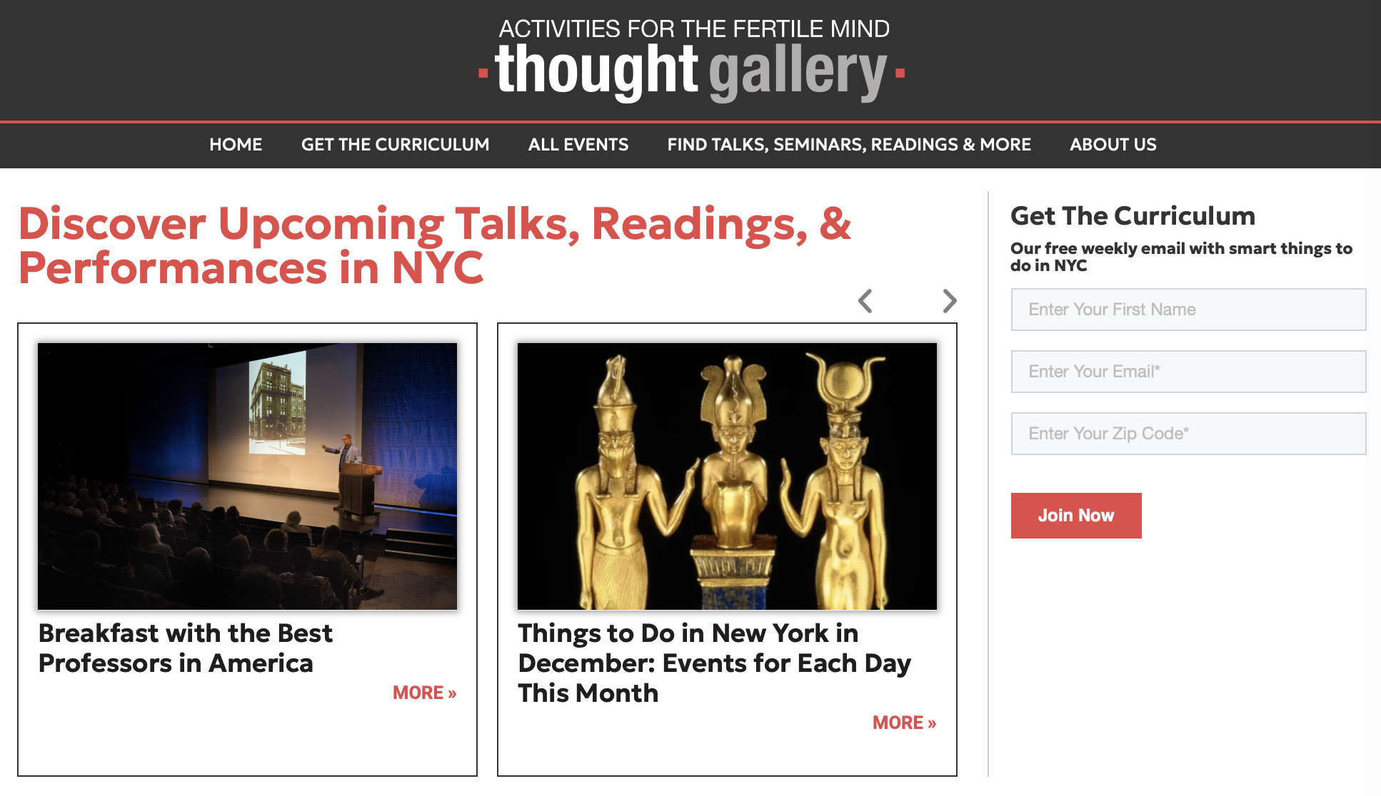 If you google “talks and lectures in New York City,” we’ve been number one for 12 years. If there is a very specific thing that you’re looking for, Thought Gallery generally has it listed. Then the question is: how many people among our 7 million fellow New Yorkers are looking for talks, lectures, and smart things to do, and how many are doing so any given week in New York… Our audience is mostly educated people who live in Manhattan and Brooklyn. They are either on the younger side without kids or on the older side. The kids have left the house, so they have time to go out and do these things.