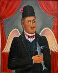 Another discovery from the same stacks is a painting with a lighthearted, dreamy, and quasi-surreal flair—perhaps best described today as “outsider art.” Gazing at it, I can almost hear a distant drum roll as the theater curtain opens to reveal a man in a fez, bow tie, and tuxedo, holding a giant sardine (or is it mackerel?) in his right hand. The artist hints at irony with the smile beneath his handlebar mustaches, while the man’s undersized wings nod to the connection between the human and the divine. Despite the seemingly mismatched elements, he appears to me as a fanciful, loving dream of an Ottoman man.